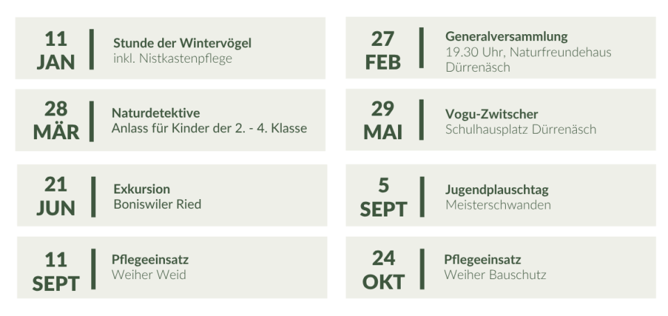 Wir organisieren Veranstaltungen rund um Ökologie und Naturschutz. Ausserdem pflegen wir Wiesen, Hecken sowie Teiche und betreuen ca. 300 Nistkästen.